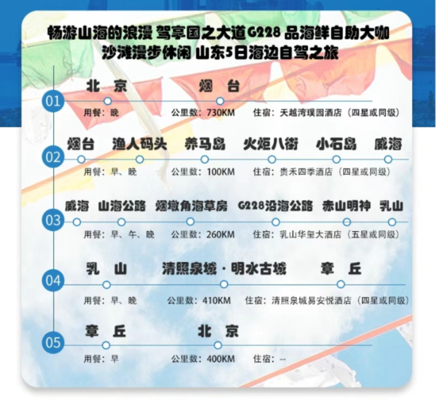 DAY 01北京--烟台 730KM餐:晚 住:烟台 早8点 京台高速(G3)万庄服务区集合,粘车贴,发手台,随后车队出发前往烟台,沿途午餐服务区自理。下午到达后入住酒店,酒店晚餐后自由活动,可以前往所城里逛一逛,感受所城里的烟火气和美丽的夜景。